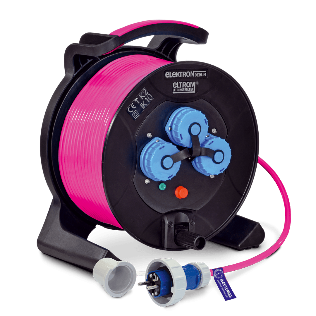 Our cable reels have been specially developed for the professional sector and are therefore extremely robust and low-maintenance. ELTROM®2 310/3S IP55 Cable reels are used in construction, trade and industry. Equipped with 3 water-pressure-tight IP 68 protective contact sockets, special ring wiring, 5 signal colors for cable and reel, 30 m / 40 m / 50 m.